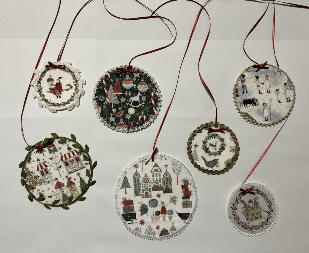 アクファクタムプリントを丸く切り抜いたクリスマス・オーナメント、大きさいろいろ7つ出来ました。
