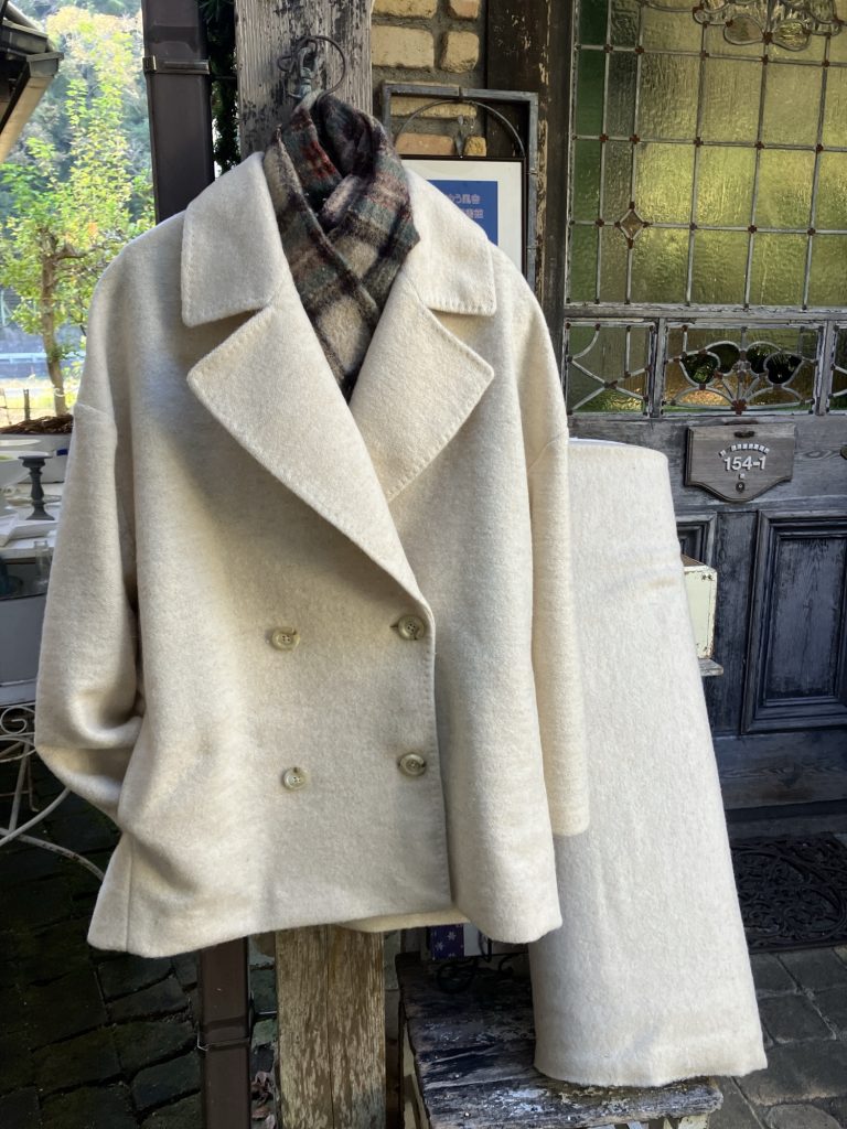 ちょうどクリーム色の暖かそうなウール生地を仕入れていたのでピッタリ!と思いました。(写真、右側、かなり幅広のウールです)