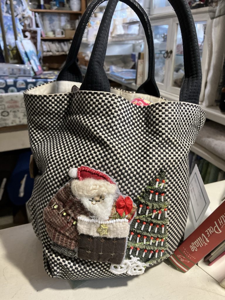 今日、提げておられたのは去年買っていただいたサンタとツリーのブローチ、それぞれ単品ですが、上手く合体、アレンジして この時期ならではのバッグにしておられました。