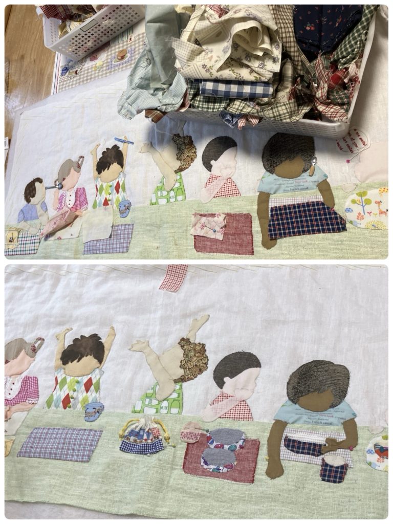 絵キルト歴がまだそれほど長くないYさんにはもう少し楽に完成するものから入っていただこうと、同じ時期に作ったキット[ランチタイム]を[いただきます!]の子ども達と同じくらいに拡大して取り組んでいただいています。