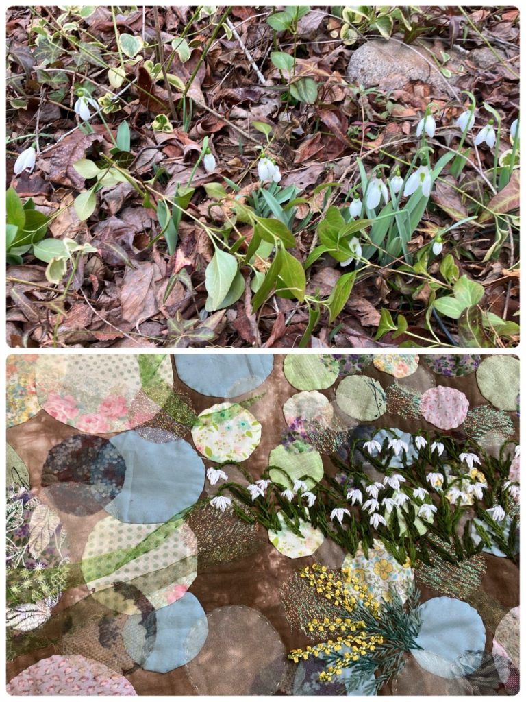 先週、ゆう風舎のドアを出たところに咲くスノウドロップの花を見て、早速キルトに刺して来てくれたIさん。