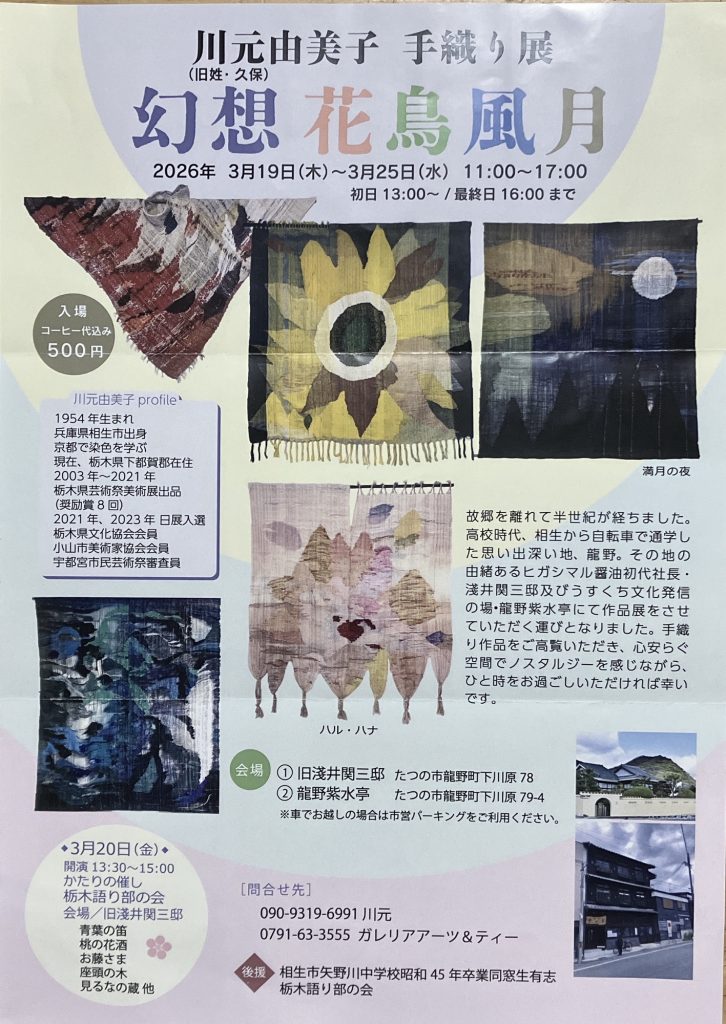 今は栃木県にお住まいですが、龍野高校出身ですから相生から龍野まで自転車で通学しておられたのでご本人にとっても懐かしい場所での個展となりました。